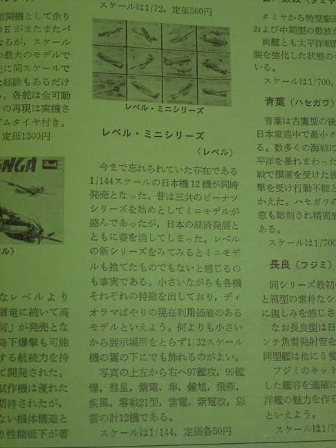 モデルアート(1972年9月号(第66集))の「今月の新製品紹介」にレベル・ミニ・シリーズ日本機が紹介されていました(以下写真のモデルアートは私が最近、古書店で再購入したものです)。子供の頃、この新製品紹介の記事を何度も見ていました。おかげで、モデルアートはボロボロになり当時のものは現存していない訳です。駄菓子屋ではNo.9以降の製品の入荷がなく、「No.9 零戦21型」〜「No.12 彩雲」は当時の私にとっては店頭で見たことのない幻のキットでした。
