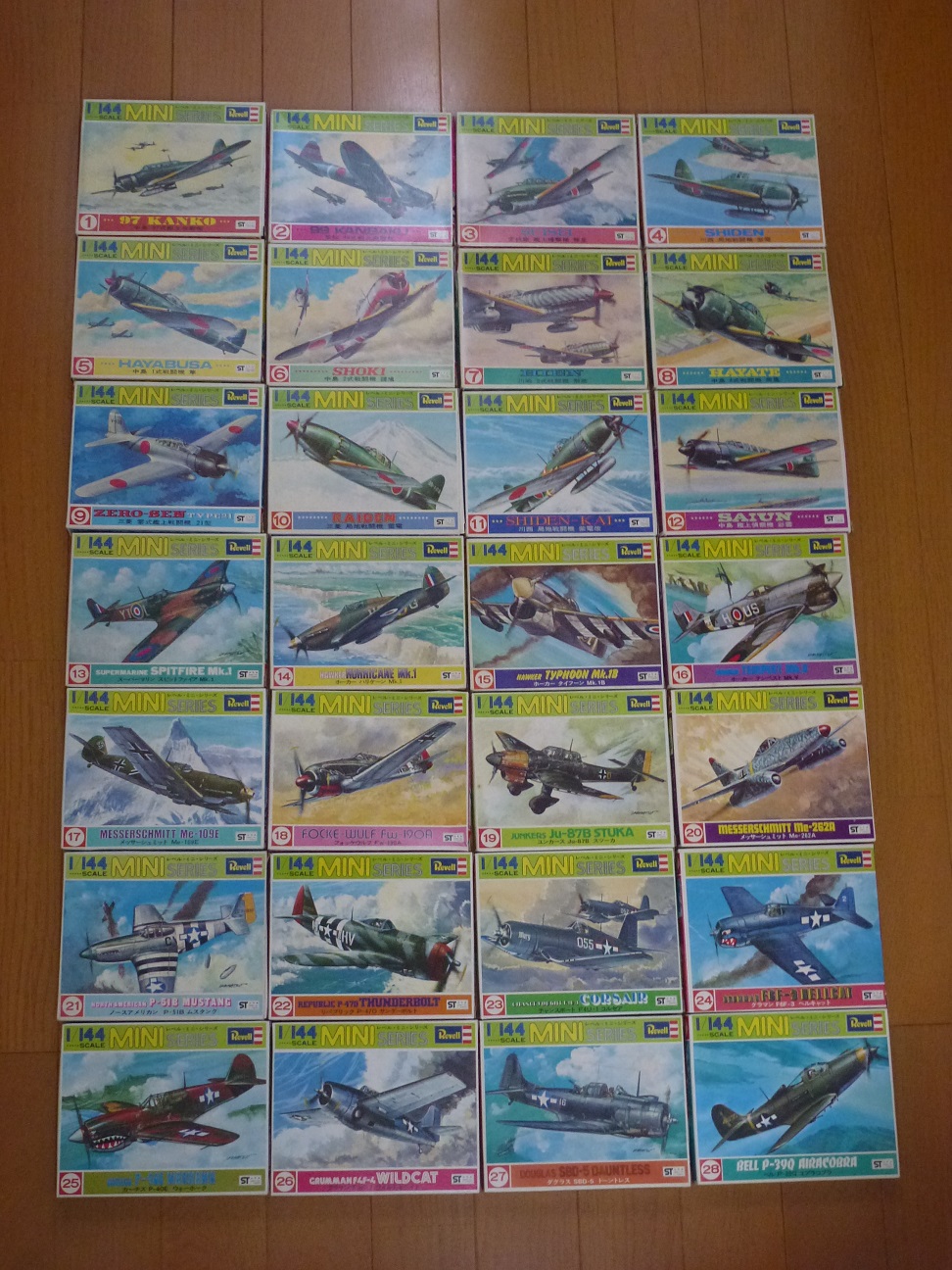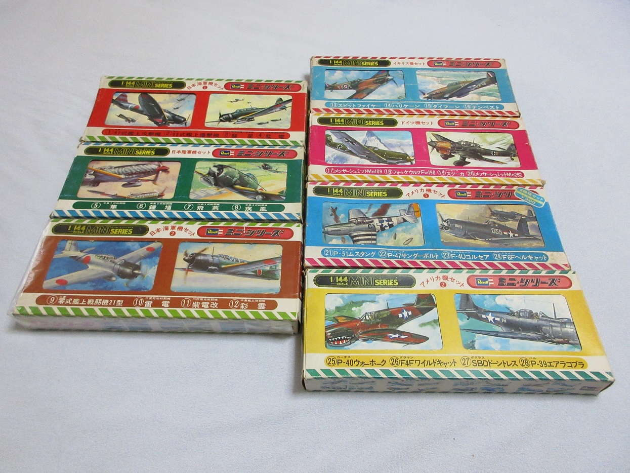 以下の写真がレベル・ミニ・シリーズ全製品の写真ですが、駄菓子屋では入荷するプラモが限られていたのか私が店頭で目にしたのは日本機では「No.1 97艦攻」〜「No.8 疾風」でした。しかも「No.4 紫電」以外の製品がプラモデル棚に並んでいたのは一時的で、いつも「No.4 紫電」ばかりが店頭にあった記憶があります。