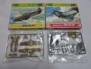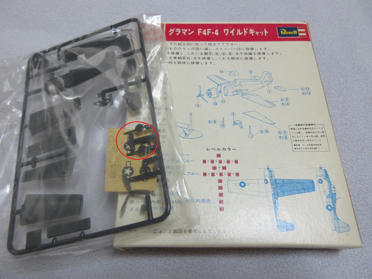 私の行きつけの駄菓子屋でも外国機の製品が店頭に並びましたが、相変わらず入荷する製品は限られていて私が作ったのは以下のハリケーンとワイルドキャットでした。ワイルドキャットは組み立て説明書の通りに脚の部品(赤丸中の部品)を取り付けるとタイヤが斜めになってしまい、50円のプラモでありながら結局完成しなかった記憶があります。
