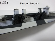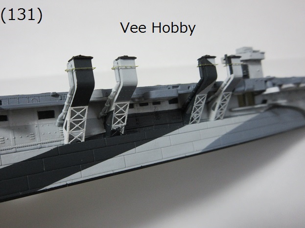 - (133) ドラゴンのキットの煙突も船体に取り付けました((133)参照)。ドラゴンの煙突の支柱部品(エッチングパーツ)はVee Hobbyの部品と異なり4つの煙突で共通の部品となっています。ただ、Vee Hobbyのキットと同様に取り付ける部分の凸モールドにぶつかる部分があるので、船体の凸モールドを削って支柱部品を船体に取り付けました。