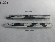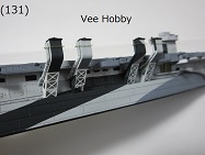 - (87)〜(88) Vee Hobbyのスポンソンの部品ですが最新のキットだけあってなかなかよくできていると思います。スポンソンは実物では船体に繋がっているのですが、ドラゴンのキットでは飛行甲板の縁についているようになっています。Vee Hobbyのキットでは船体に繋がっているように再現されています((87)参照)。また、ドラゴンのキットでは甲板の側面のモールドは何もありませんが、Vee Hobbyのキットでは細かいモールドが施されています((88)の赤丸中)。