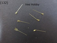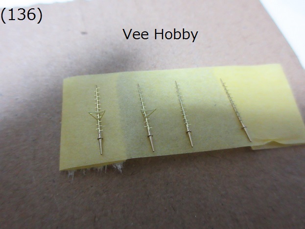 - (134)〜(136) Vee Hobbyの豪華版キットでは空中線支柱((135)の赤丸中の支柱)が整形した真鍮棒の部品で提供されています((134)参照)。支柱にはキット付属のエッチングパーツを取り付けるよう指示されています。(136)は空中線支柱の部品にエッチングパーツを取り付けた状態です。