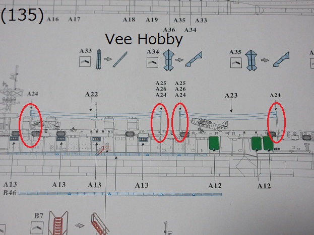 - (83) 飛行甲板前部の20mm単装機銃の配置((83)の赤丸中)は、実物の写真をみるとキット通りのようですのでそのままとします。