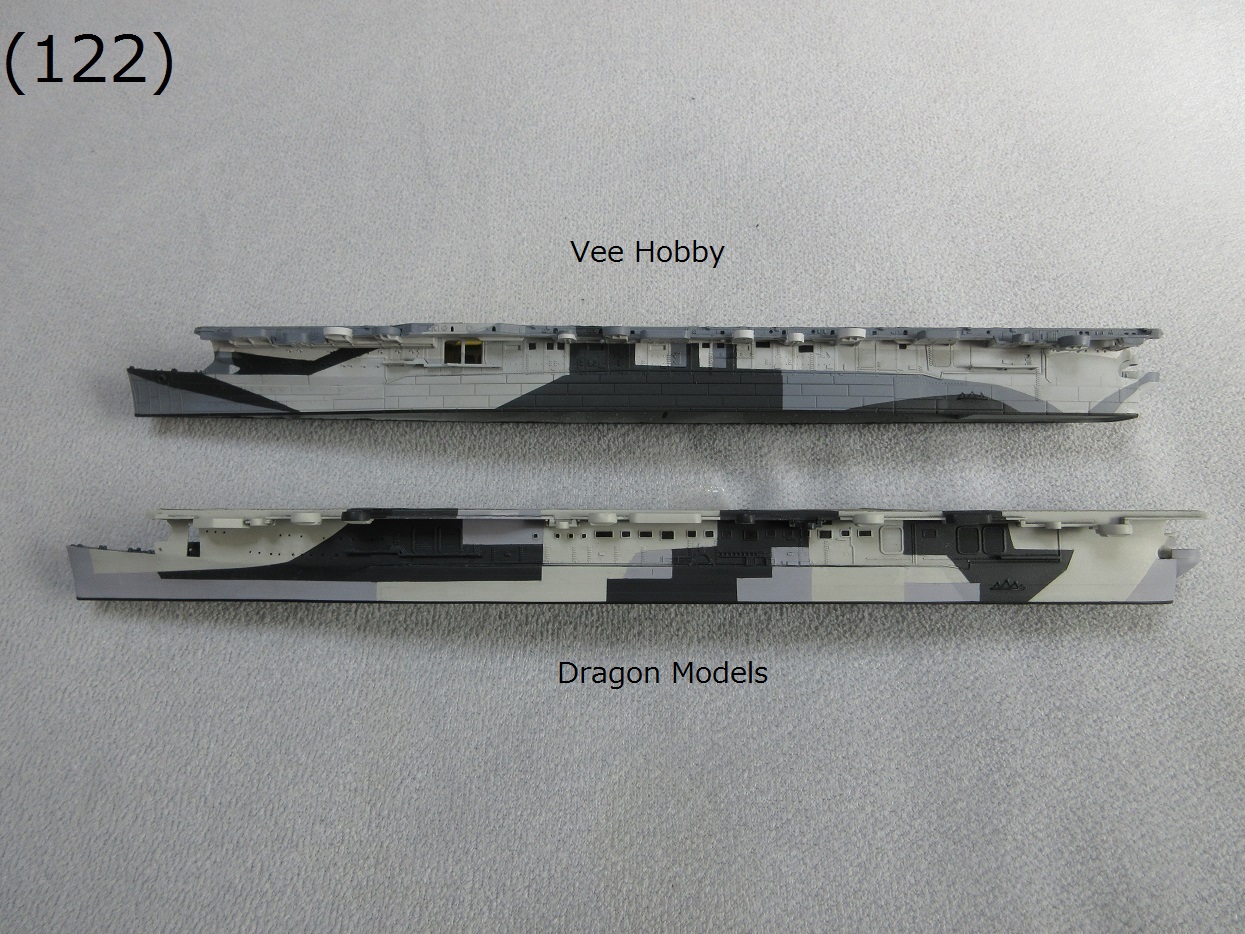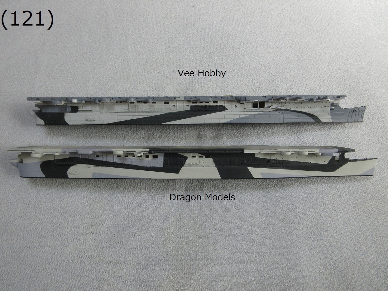- (35)〜(37)船体側面の部品を取り付けました。(35)はVee Hobbyとドラゴンのキットの船体です。Vee Hobbyのキットでは格納庫内側面のモールドも再現されています((37)参照)。やっぱり面倒でも格納庫内部も再現してシャッター開けた状態で製作した方がよかったかな。今更変えられないのですが…。