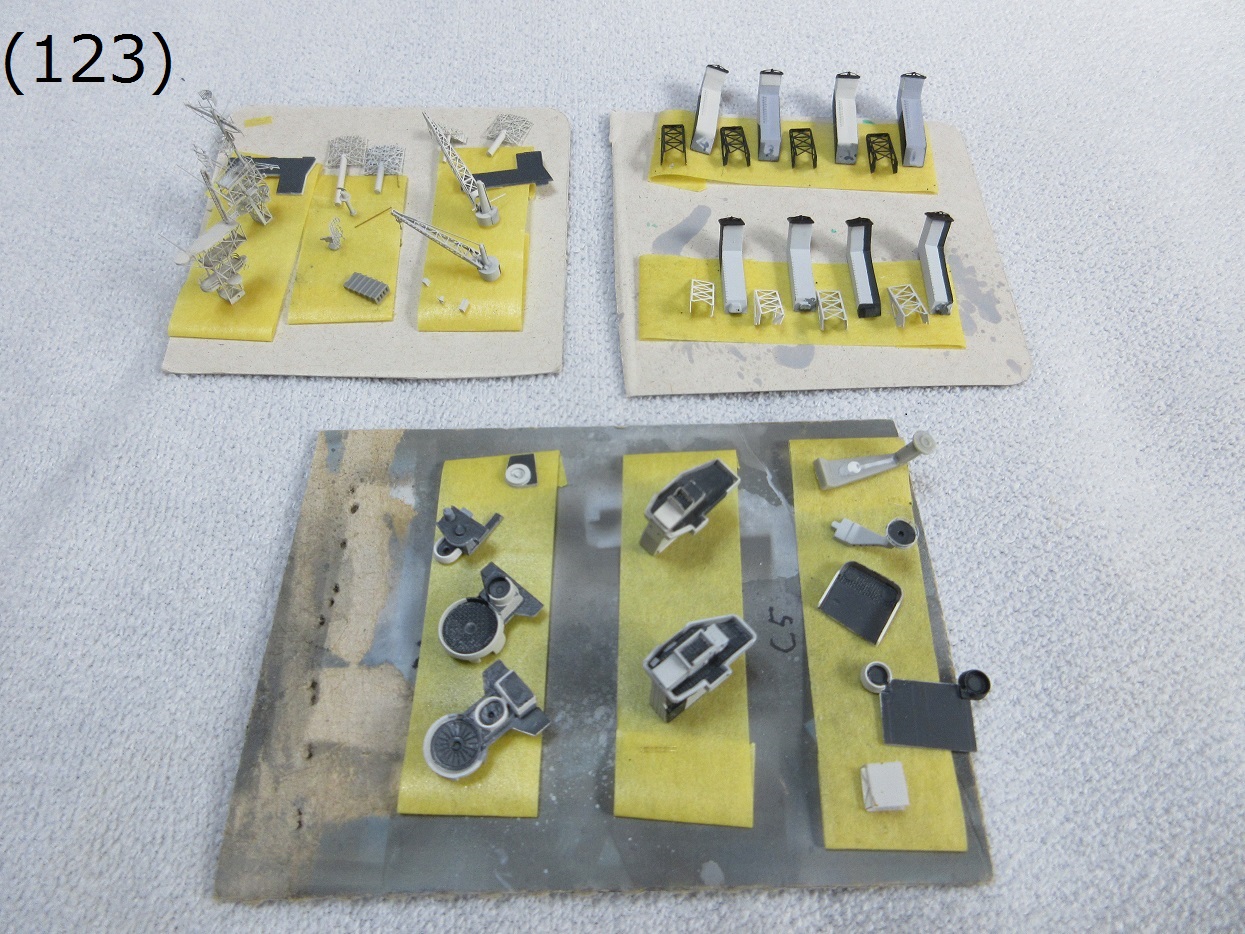 - (123) エアブラシ塗装を行った船体以外の部品です。船体と同じく塗料がはみ出した部分修正後に、タミヤのスミ入れ塗料(ブラック)で軽くスミ入れしました。