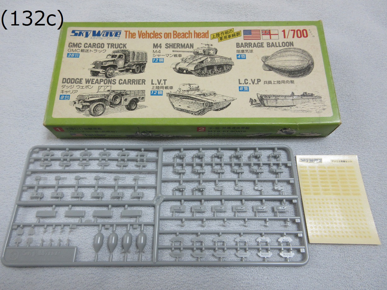 このLSTに付属していた車両を別売するキット「No.6 軍用車輛群」も発売されました((132a)参照)。 この「No.6 軍用車輛群」にはLSTに付属していた車輛だけでなくLVT(上陸用戦車)や阻塞気球、更に扉を別部品にしたLCVP(兵員上陸用舟艇)も含まれていて、 上陸作戦のディオラマ製作には非常に有用なキットでした。