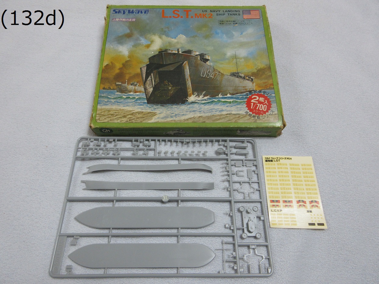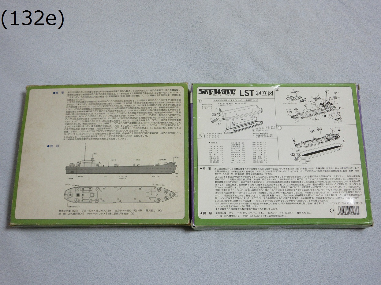 いくつかの製品を一つずつみていくと、(132)はスカイウェーブシリーズ「No.4 LST(大型揚陸艇)」のキットと完成品です。 欧州海戦史第七刊で製作したものです。このキットは小さな戦車や軍用車両が付属していたのが非常に印象的でした。 WLシリーズには無かったタイプのキットでした。現在の製品((132e)の右側)では箱の裏側は主に組み立て説明になっていますが、 発売当初は(132e)の左側のようにLSTの図面が描かれていて組み立て説明書は箱の中に紙で入っていました。