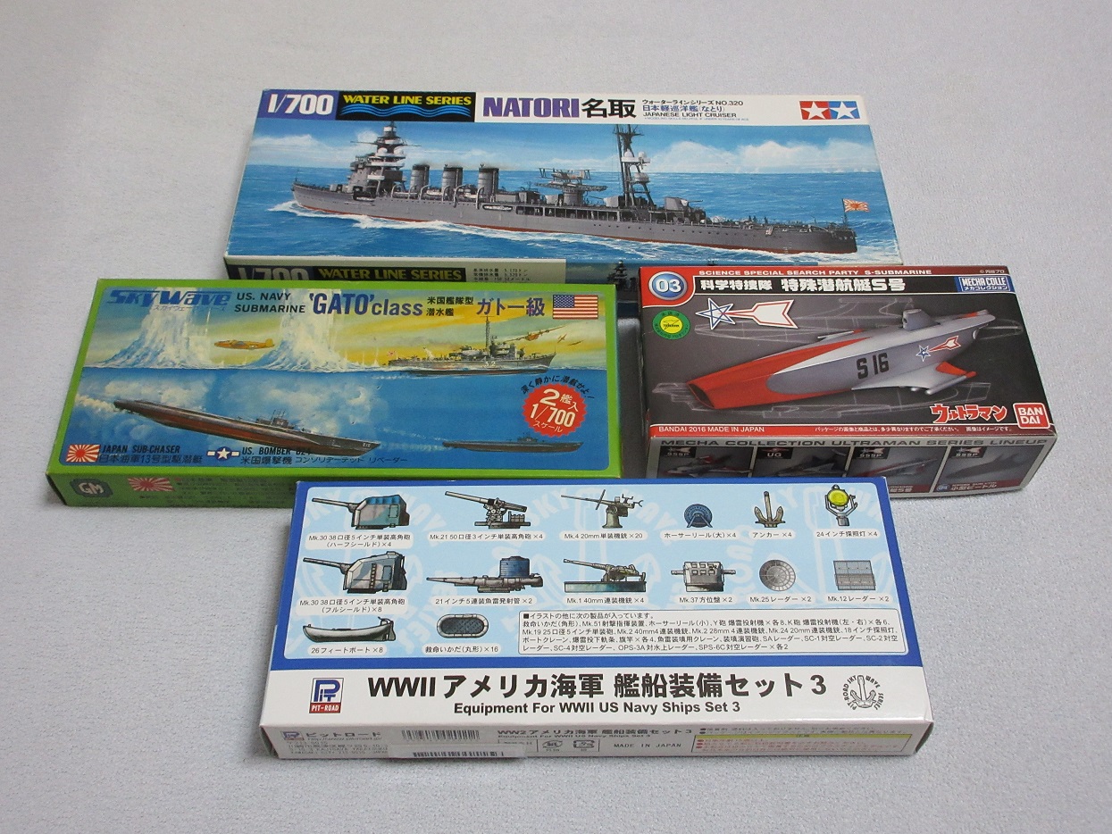 以下が今回アキバで入手したものです。グリーンマックスの「ガトー級」とタミヤの「名取」はレオナルドLGで購入したものです。武装パーツはヨドバシでの購入物です。この武装パーツ何故か最近品薄で中古模型店でも見つけられなかったものです。科学特捜隊(ウルトラマン)の特殊潜航艇は旧友からのいただきものです。科特隊の特殊潜航艇か。一応分類はフネですね。